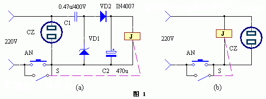 图1(a)中继电器最好选取线圈工作电压为24V或48V的,这样相应的线圈电流要小些,以降低对C1容量的要求,触点电流要根据负载大小适当选取。VD1要根据继电器工作电压选取,一般选取稳压值稍高于继电器线圈工作电压1W的稳压二极管,C1的耐压不低于400V,630V更好,C2的耐压也要根据VD1的稳压值适当选取。