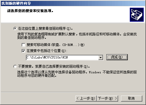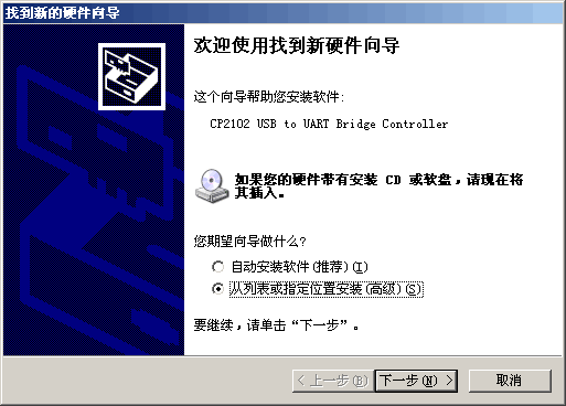 1、首先要运行串口驱动安装程序出现如下介面,请不要自动安装软件,选成从列表或者指定位置安装: